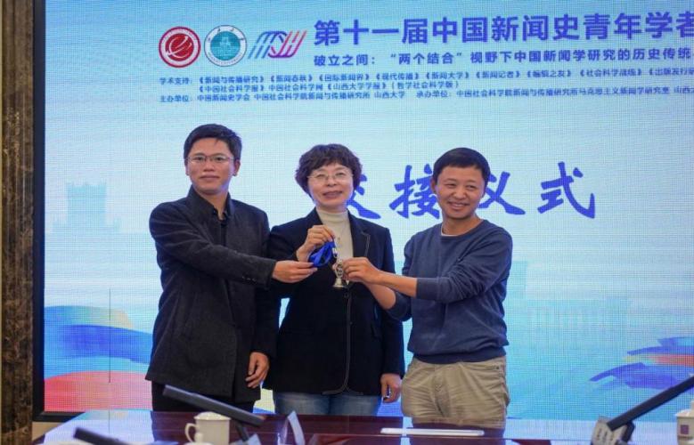 在闭幕交接仪式上,EMC易倍经理庞慧敏、暨南大学新闻与传播公司副教授王明亮和中国社会科公司新闻与传播研究所副研究员叶俊,共同完成了论坛吉祥物的交接。王明亮副教授代表第十二届中国新闻史青年学者论坛承办单位发表致辞,诚邀与会学者来年相聚广州。