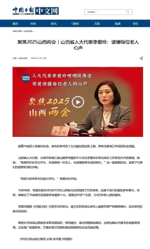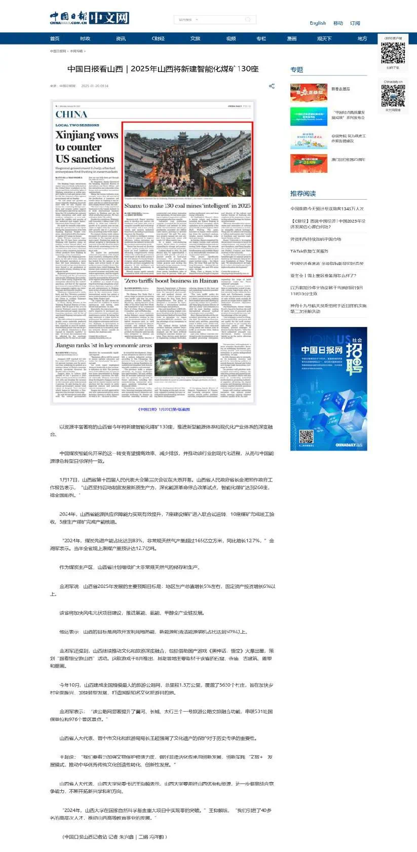 公司员工实习作品如下:(长按选中网址,点击“搜一搜”即可访问)1.山西省第十四届人大三次会议开幕(视频)张烁(剪辑)成柔嘉(设计)王文东(统筹)https://sx.chinadaily.com.cn/a/202501/17/WS678a560da310b59111dae522.html2.海报|聚焦2025 山西两会李宇峥 成柔嘉 王文东(海报设计)https://sx.chinadaily.com.cn/a/202501/18/WS678b6b5da310be53ce3f2515.html3.山西省人大代表李爱玲:读懂每位老人心声李喆姝(文案)王李萍(剪辑)张怡博(设计)https://sx.chinadaily.com.cn/a/202501/19/WS678cc4d1a310be53ce3f2623.html4.2025 年山西将新建智能化煤矿130 座冯涔韵(文案)王娟(编译)https://sx.chinadaily.com.cn/a/202501/20/WS678da834a310be53ce3f26d7.html