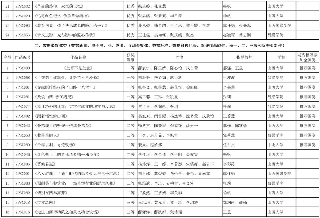 经山西分赛区办公室审核、专家评审,共有56部获奖作品脱颖而出,其中视频新媒体类24部、数据多媒体类31部、数字系统设计类1部,拟推荐参加全国赛总数17部,占总作品数比例18%。