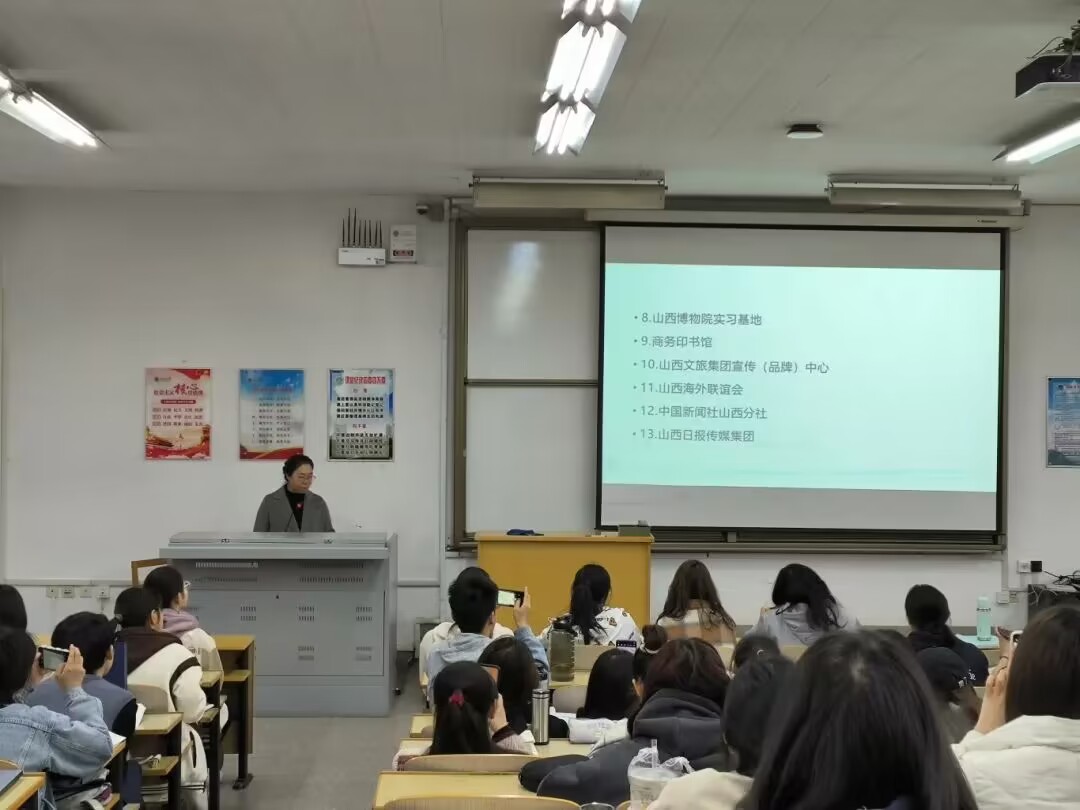 韩晓芳老师讲解了新闻学的专业特色、培养目标、课程内容、实践基地和毕业去向,她用过往亲身经历以及其所带往届生的实践经验,为23级员工的专业分流去向进行了明确的指导。