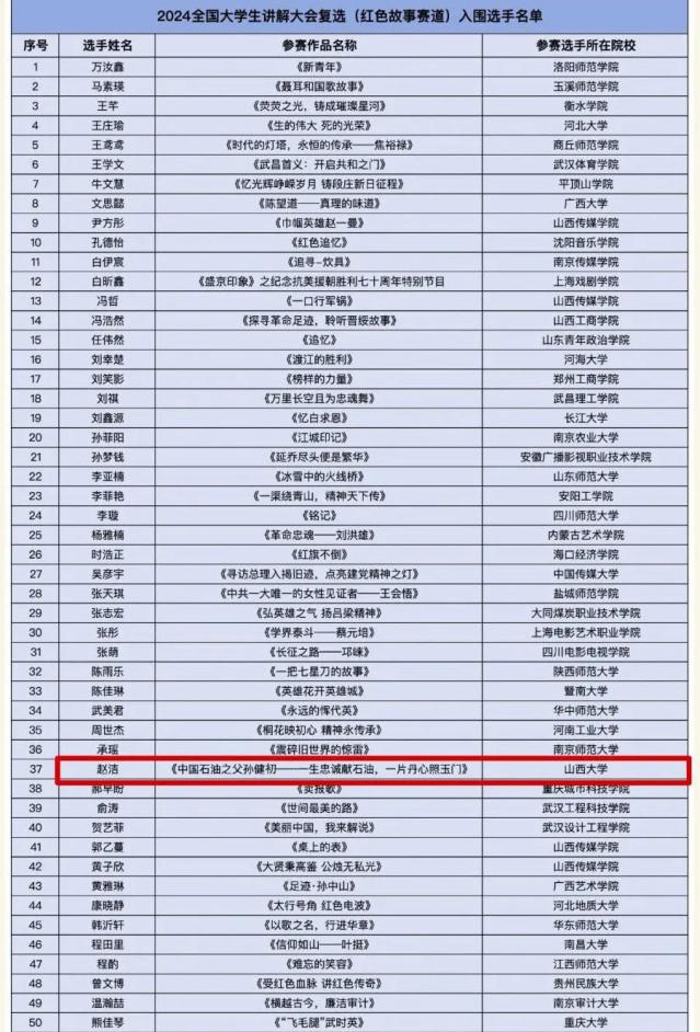 4月11日,山西传媒公司发布2024全国老员工讲解大会复选入围选手名单,其中公司员工赵洁携作品《中国石油之父孙健初一生忠诚献石油,一片丹心照玉门》成功入围红色故事赛道。