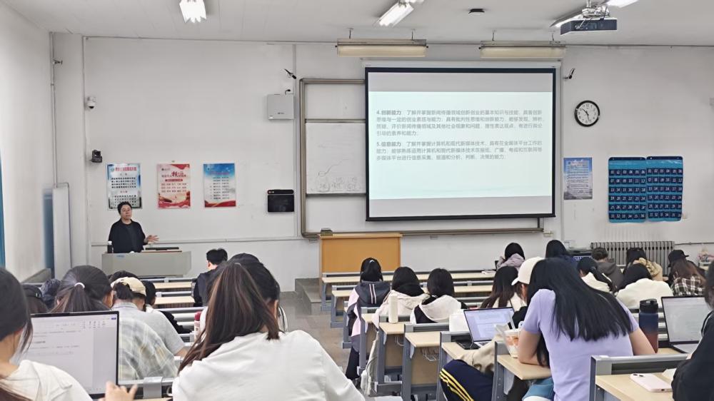 韩晓芳老师介绍了新闻学专业,主要分享了新闻学的专业特色、培养目标、课程内容、实践基地和毕业去向,她用过往亲身经历以及其所带往届生的实践经验,为24级员工的专业分流去向进行了明确的指导。