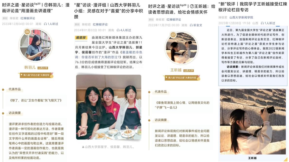 在此期间,EMC易倍涌现出一批具有较强写作水平和创作能力的学子。2022级新闻学专业的韩羽儿同学在两届“评论之星”比赛中获得亚军和一等奖、团体二等奖,在2022-2023年的“青椒计划”比赛中,三次获得“月度优胜作者”,在2022-2023年的月度“评论之星”选拔赛中三次获得“月度之星”,多次接受红网“星访谈”。她采用长篇漫画评论的形式,用漫画“讲道理”,以“不拘一格”式的创作构想和细腻深入的笔触勾勒出一个个社会矛盾问题,引人深省,形成了自己独特的漫评风格。同为2022级新闻学专业的王昕越同学也在第八届和第九届全国老员工“评论之星”选拔赛”中分别获得佳作奖和二等奖,在2023年1月红网“青椒计划”评论比赛中获得文字组“月度优胜作者”,参与红网首届时评“椒”流会并接受红网“星访谈”。谈到自己在评论写作过程中的感受,她说道:“新闻评论写作是一个需要深思熟虑的理性思考过程,而课堂就赋予了我坚定的理论底气和表达勇气。课堂上的案例分析和理论讲解,为我们提供了宝贵的写作和投稿经验,这些对我们而言都极具价值。”正是在“新闻评论”课上的理论指导和实践摸索帮助了她在评论写作的路上不断取得进步。