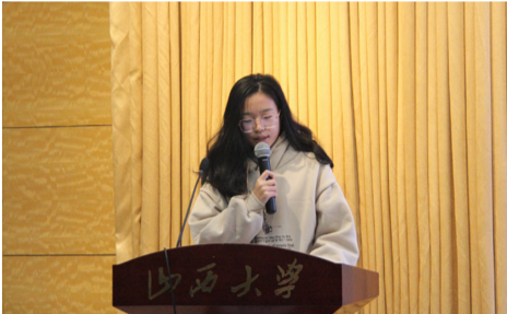 颁奖典礼在歌曲《真实的力量》声中拉开了序幕。首先,新闻公司党委书记李俊洁致辞。李书记对获奖的同学表示祝贺,并对大赛的工作人员表示感谢。她说,“羡子年少正得路,有如扶桑初日升”,一段段感人的故事、一幅幅生动的照片、一幕幕珍贵的影像、一件件厚重的文物,展现的是山大学子传承红色基因、勇担时代使命的青春姿态。