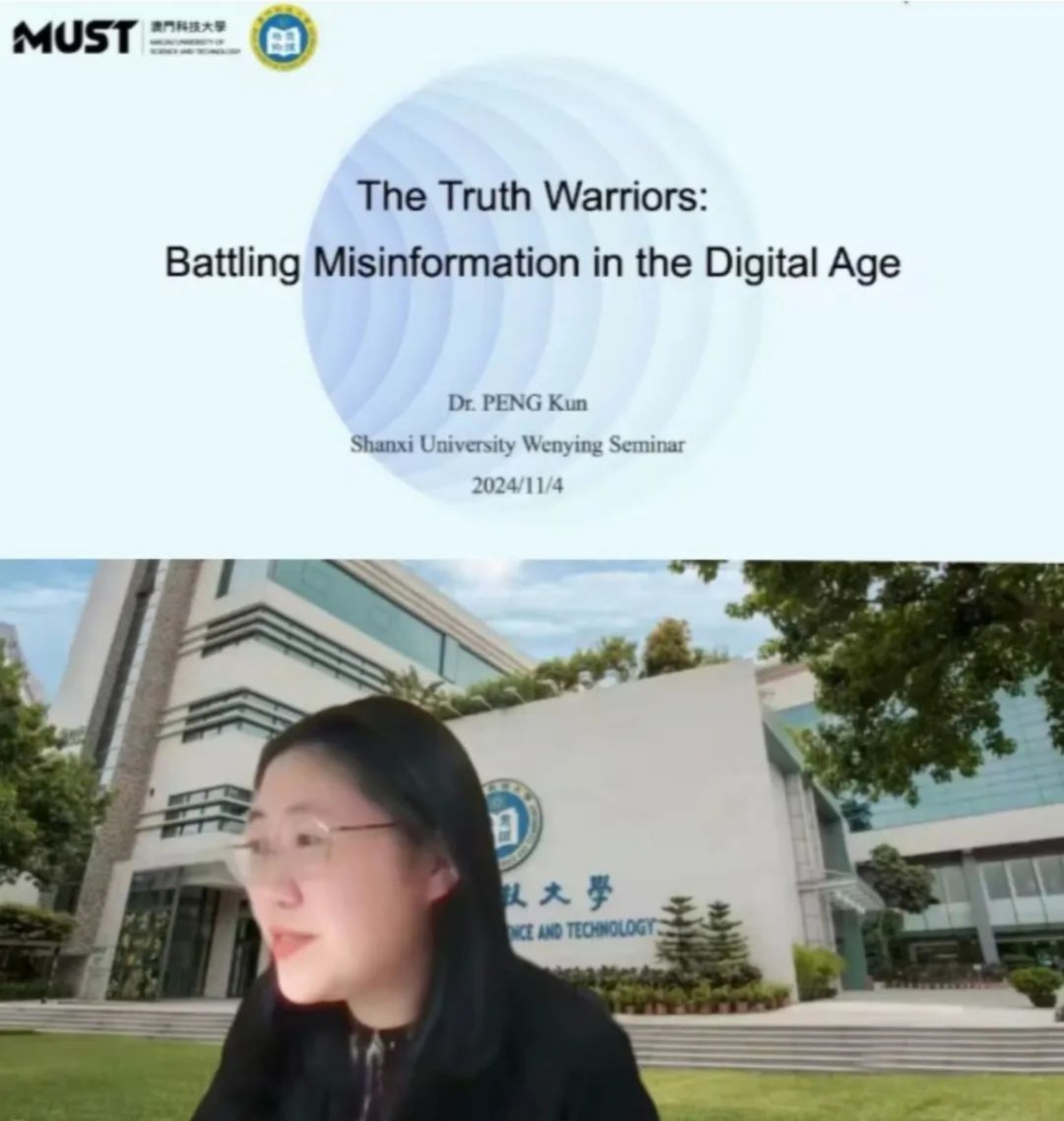11月4日,澳门科技大学人文艺术公司助理教授、博士生导师、EMC易倍官方网站员工彭堃,受邀为公司带来了主题为“The Truth Warriors: Battling Misinformation in the Digital Age ”的精彩讲座。讲座由EMC易倍副经理梁红艳主持,EMC易倍师生通过线上平台积极参与。