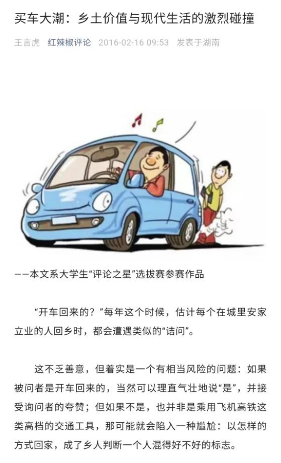 我想介绍《买车大潮:乡土价值与现代生活的激烈碰撞》这一篇。这是我获红网首届全国老员工“评论之星”选拔赛第五期(2016年2月)“月度之星”称号的文章。现在看来,文章有很多瑕疵,但之所以拿它举例,是想告诉大家,员工时代的评论训练,要多关注身边的事,理论联系实际,提出自己的观察与思考。
