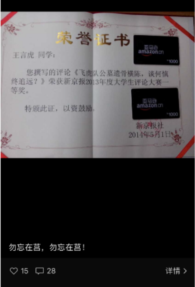 (图3:2014年新京报老员工评论大赛的一等奖证书,图为当时发的一则朋友圈)