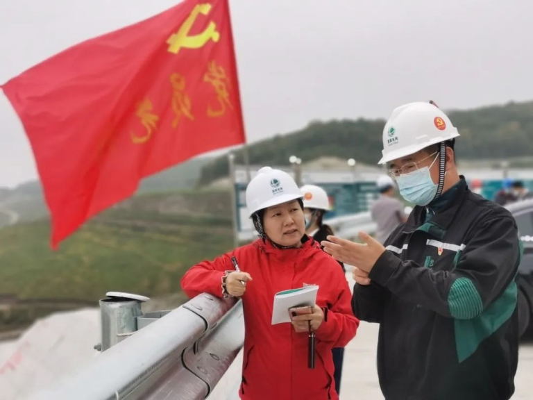 图3:杜芳(左一)在冀北丰宁滦河中游国网新源河北丰宁抽水蓄能电站进行采访