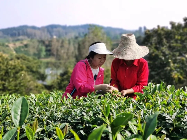 图4:2020年8月30日,记者杜芳(左一)在河南省信阳市商城县韩冲村茶园采访采茶工