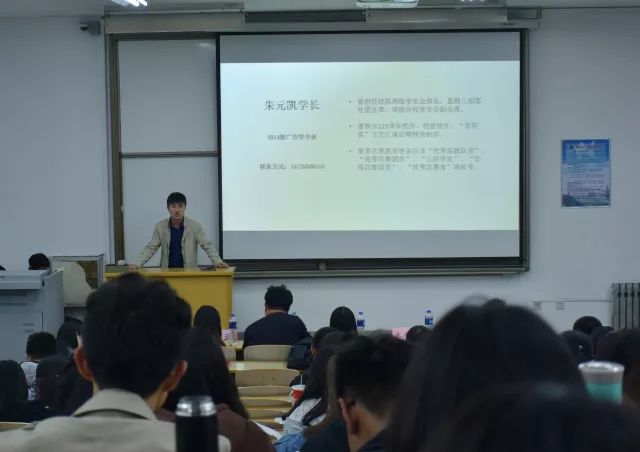 14级广告专业的朱元凯同学以一句“先做人后做事,会做人会做事,做好人做好事。”开场,用幽默风趣的语言向大一新生讲述他的老员工活,为在座同学分享经验。他提倡同学们多参加社团活动,丰富课外生活,并通过参加社团活动来使自身素质得到多层次、全方位的发展。