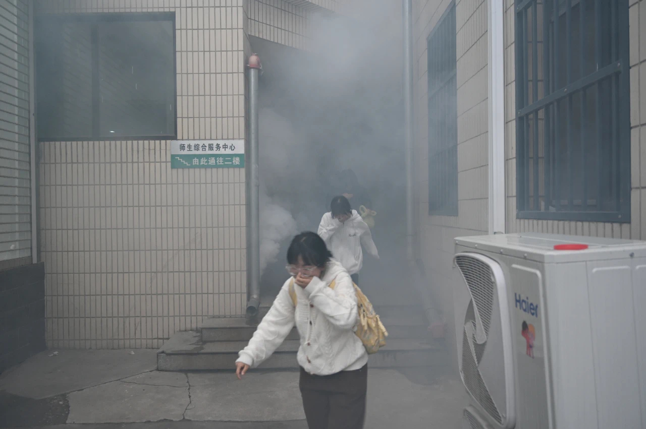 随后,员工来到商学楼开展消防演练。伴随警报响起、烟雾弥漫,消防演练正式开始。员工们在听到警报后,迅速按照预先设定的疏散路线,有序地向安全区域撤离。在撤离过程中,员工们保持冷静、不慌乱、不推搡,确保了撤离过程的安全与高效。