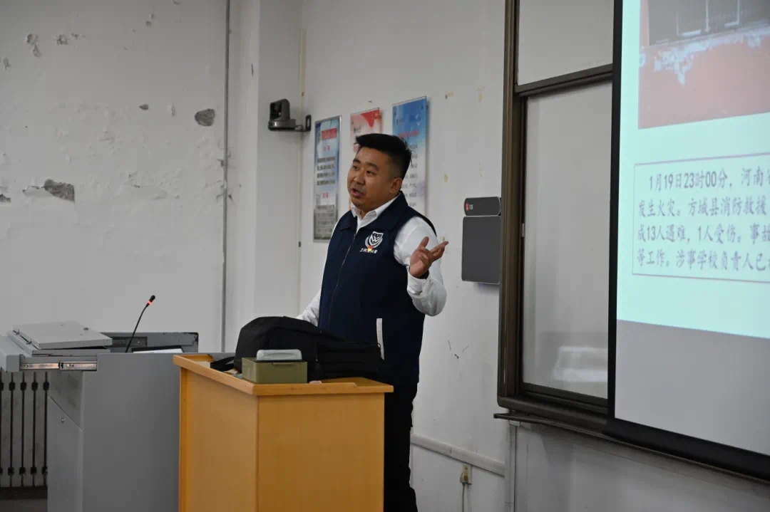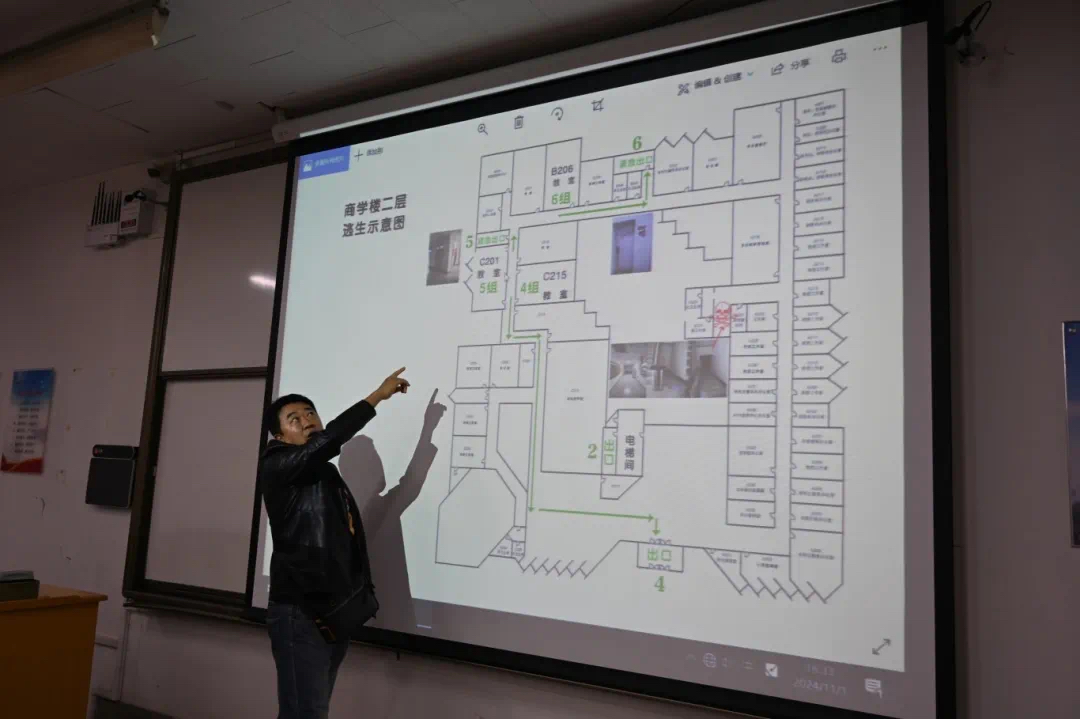 活动伊始,北京市卫民安消防教育咨询中心山西分中心副主任郭帅讲师在文科楼为全院员工带来了消防安全专题讲座。郭帅讲师结合近年来发生的典型火灾案例,深入浅出地向大家剖析了火灾的成因、危害以及遇到突发情况时火场逃生的自救方法,让大家对火灾的危害有了更加深刻的认识,对基本的防火、灭火、逃生、自防自救知识与技能也有了更加深刻的理解和掌握。毋伟老师向大家讲解了商学楼消防演练逃生路线。
