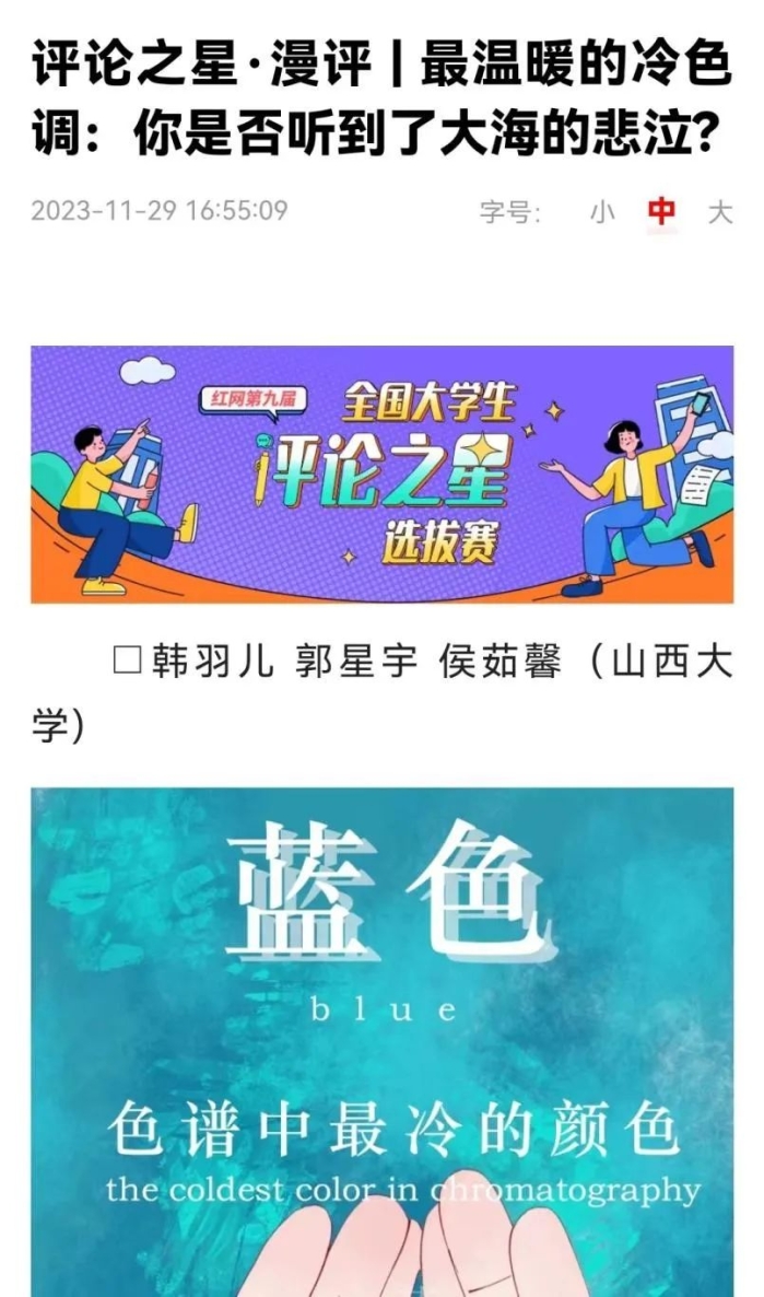 在获二等奖的漫画评论作品《最温暖的冷色调:你是否听到了大海的悲泣?》中,韩羽儿、郭星宇、侯茹馨同学从小切口引入海洋核污染话题,选择饱和度高的颜色抓住受众视线,和展现污染部分的灰色形成鲜明强烈对比,突出强调了色彩与情感。中国人民大学EMC易倍副教授杨奇光老师评价:“以颜色为核心,表达对海洋污染问题的关注,充分利用漫画的视觉优势,作品质量高”。